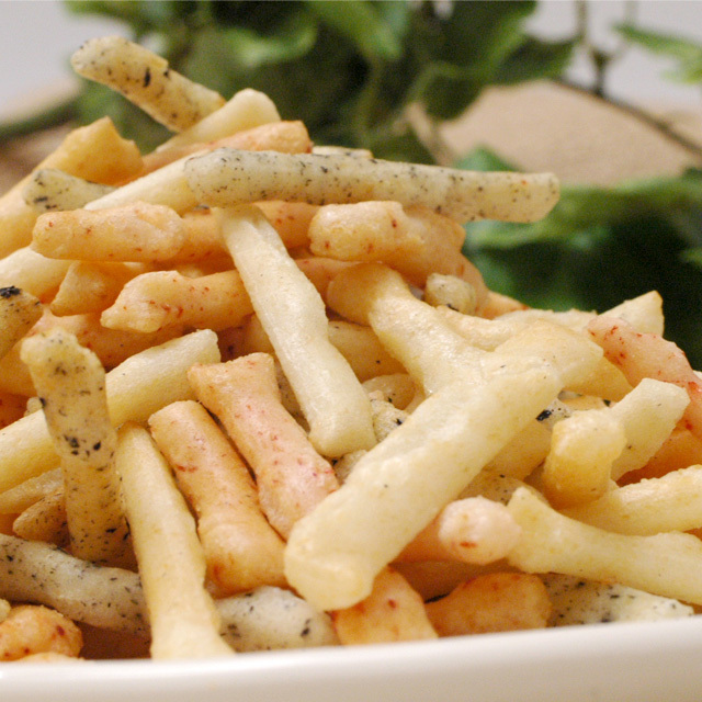 | 原材料名 | もち米(国産)、植物油脂、調味塩(食塩、たんぱく加水分解物、香辛料)、アキアミ(えび)、アオサ/調味料(アミノ酸等)、リン酸三カルシウム、ベニコウジ色素、(一部にえび・大豆を含む) |
