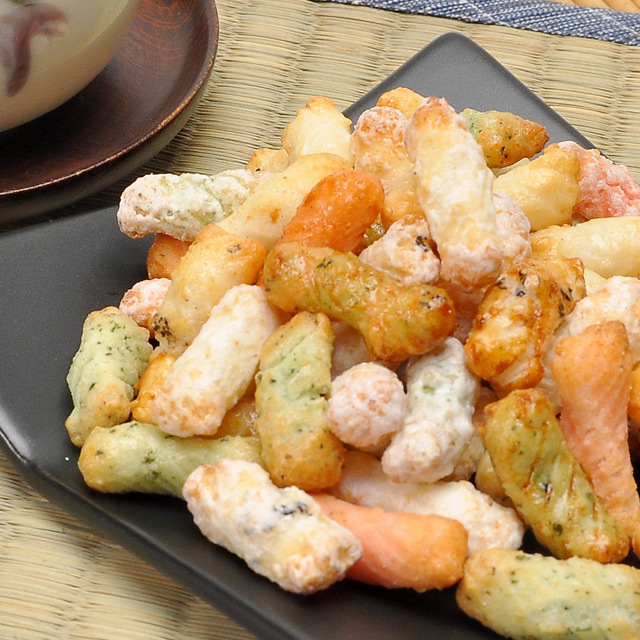 | 原材料名 | もち米(国産)、砂糖、たまりしょうゆ、米菓用調味液(醤油、水飴、植物油脂、デキストリン、食塩、砂糖)、植物油脂、調味塩(食塩、たんぱく加水分解物、香辛料)、ごま、アオサ、酢、食塩、卵白、風味調味料(食塩、砂糖、かつおぶし粉末、かつおぶしエキス)/調味料(アミノ酸等)、酒精、乳化剤、酸化防止剤(チャ抽出物、V.E)、酸味料、着色料(カラメル、ベニコウジ、クチナシ)、リン酸三カルシウム、(一部に大豆・小麦・卵・ごまを含む) |
