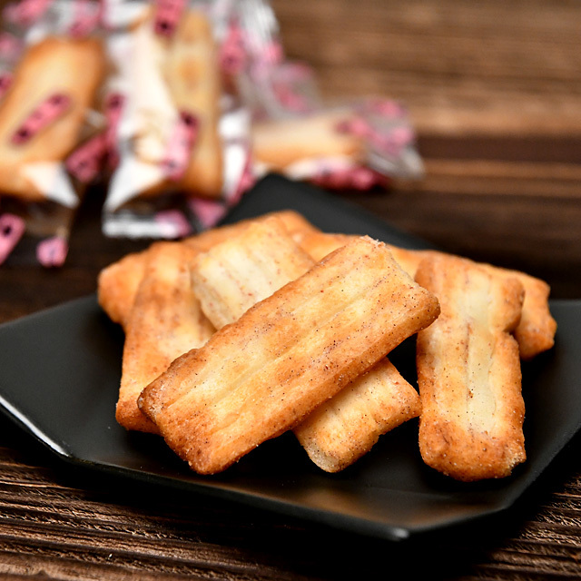 国内産もち米を使用し、杵と臼でしっかりと搗きました。そのあられ生地に乾燥梅肉とザラメ糖で味付けしました。あられの食感と甘酸っぱい味が人気の商品です。