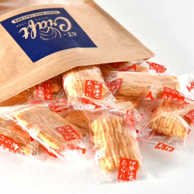 国産もち米を主原料に使用し昔ながらの杵搗きにこだわり職人の手作業で手返しをしたあられ生地を造りました。伊勢志摩特産の伊勢海老ソルトで味付けした、磯の風味たっぷりのサラダ塩味あられです。